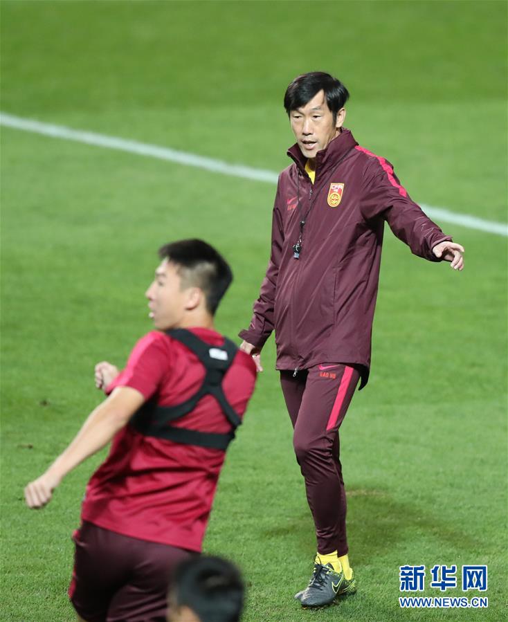 8月31日,中国队主教练高洪波(右)在训练中指导球员。当日,中国国家男子足球队在首尔世界杯体育场进行赛前训练,备战9月1日举行的2018年世界杯预选赛亚洲区12强赛与韩国队的比赛。新华社记者孟永民摄
