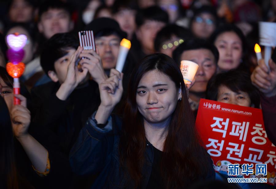 3月11日,在韩国首尔光化门广场,一名女孩手持蜡烛灯参加集会。当日,韩国民众在首尔光化门广场举行第20次、也是最后一次“倒朴”周末烛光集会,敦促彻底追究朴槿惠和相关人士的法律责任。组织者称,约有50万人参加了集会。新华社记者刘昀摄