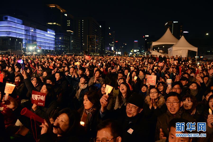 3月11日,在韩国首尔光化门广场,民众手持蜡烛灯和标语参加集会。当日,韩国民众在首尔光化门广场举行第20次、也是最后一次“倒朴”周末烛光集会,敦促彻底追究朴槿惠和相关人士的法律责任。组织者称,约有50万人参加了集会。新华社记者刘昀摄