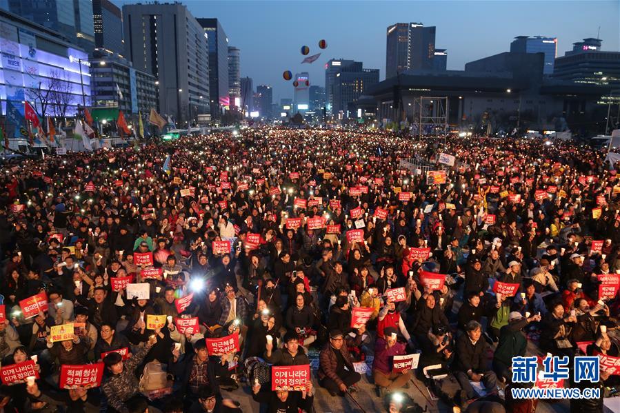 3月11日,在韩国首尔光化门广场,民众手持蜡烛灯和标语参加集会。当日,韩国民众在首尔光化门广场举行第20次、也是最后一次“倒朴”周末烛光集会,敦促彻底追究朴槿惠和相关人士的法律责任。组织者称,约有50万人参加了集会。新华社发(李相浩摄)