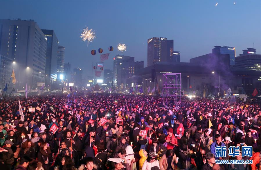 这是3月11日在韩国首尔光化门广场拍摄的集会现场。当日,韩国民众在首尔光化门广场举行第20次、也是最后一次“倒朴”周末烛光集会,敦促彻底追究朴槿惠和相关人士的法律责任。组织者称,约有50万人参加了集会。新华社发(李相浩摄)
