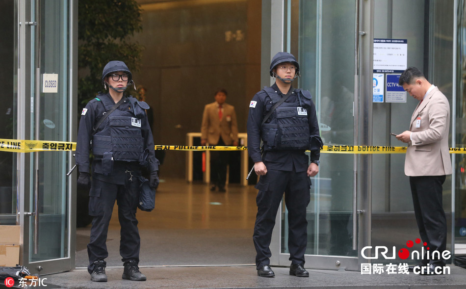 当地时间2017年4月14日,位于韩国瑞草洞的三星集团办公大楼发现“疑似爆炸物”,警方已疏散人群。图片来源:东方IC