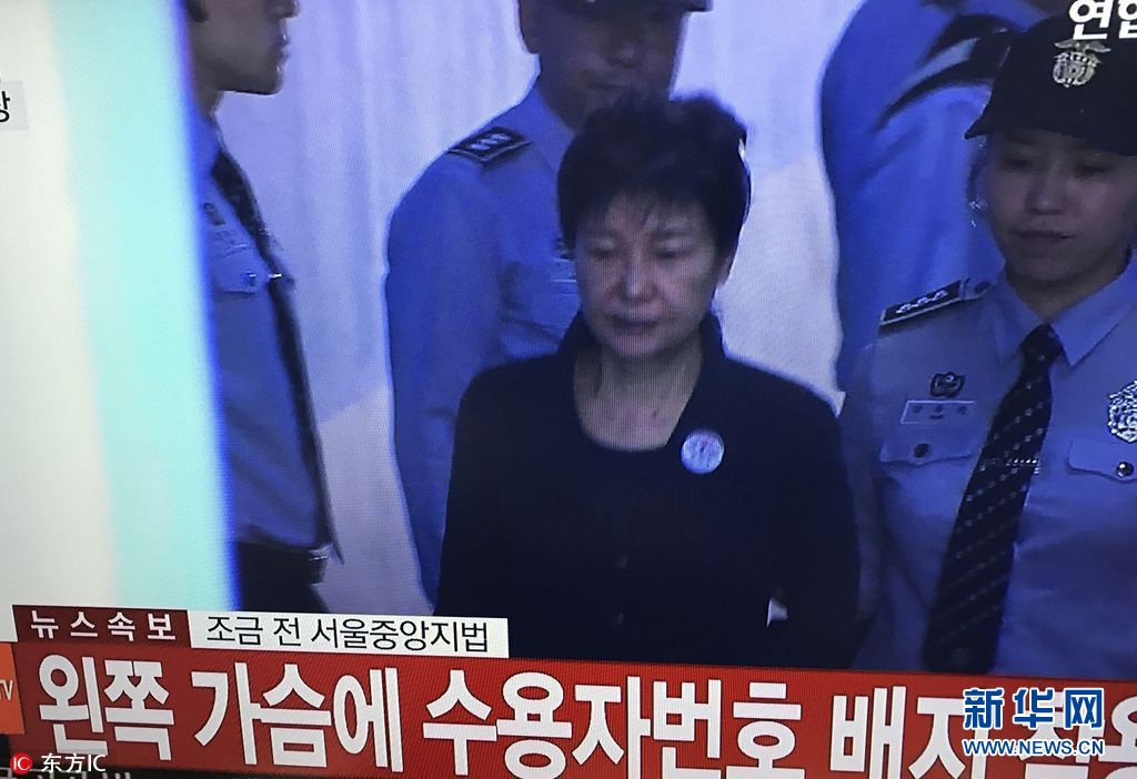 当地时间2017年5月23日,韩国联合新闻电视台播报前总统朴槿惠被押送至法庭接受首次公审。(图片来源: 东方IC)