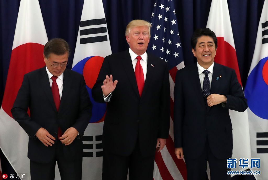 当地时间2017年7月6日,德国汉堡,G20峰会开幕前夕,韩国总统文在寅同美国总统特朗普、日本首相安倍晋三会谈,并共进晚餐。特朗普在推特上表示,这是一次非常愉快的晚宴和会谈。 (图片来源:东方IC)