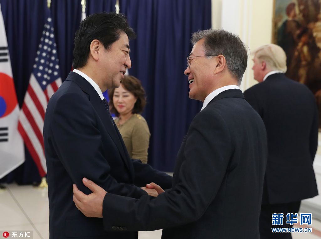 当地时间2017年7月6日,德国汉堡,G20峰会开幕前夕,韩国总统文在寅同美国总统特朗普、日本首相安倍晋三会谈,并共进晚餐。特朗普在推特上表示,这是一次非常愉快的晚宴和会谈。(图片来源: 东方IC)