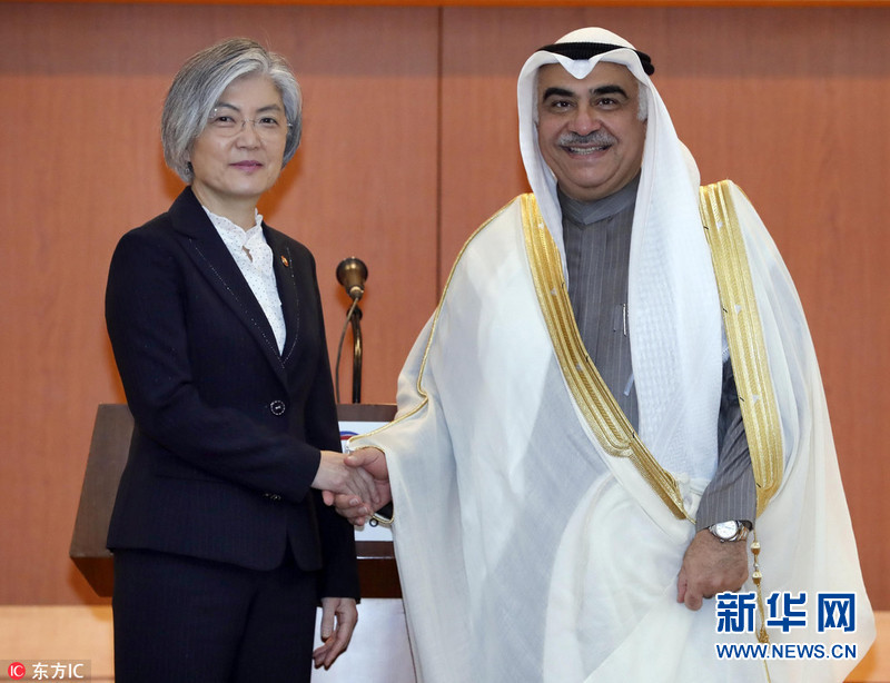 当地时间2017年10月27日,韩国首尔,在首尔外交部,韩国外长康京和(左)与到访的沙特经济规划部长阿德尔·本·穆罕默德·法科赫出席韩国-沙特经济联委会并亲切握手。(图片来源:东方IC)
