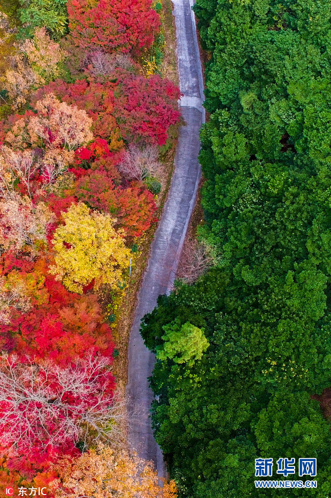 当地时间2017年11月14日,韩国丽水市,俯拍烽火山的彩色枫叶。(图片来源:东方IC)