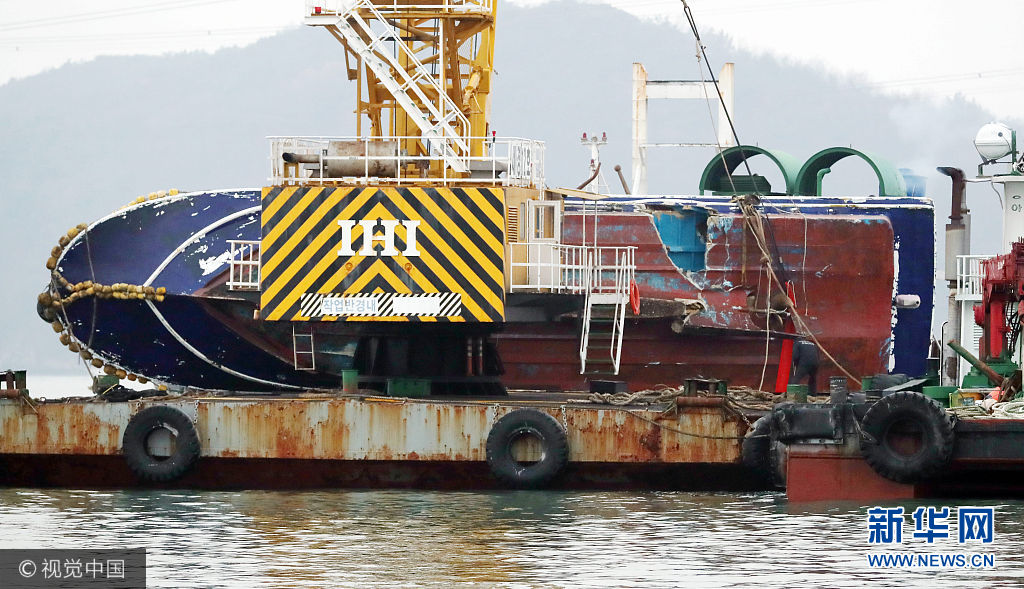 当地时间2017年12月3日,韩国仁川,3日下午,韩国海事人员用起重机船打捞失事沉船。3日上午,韩国西部仁川附近海域,一艘钓鱼船(乘坐22人)和一艘加油船相撞后翻覆。事故已造成13人丧生,数人下落不明,目前搜索工作正在继续之中。(图片来源:视觉中国)