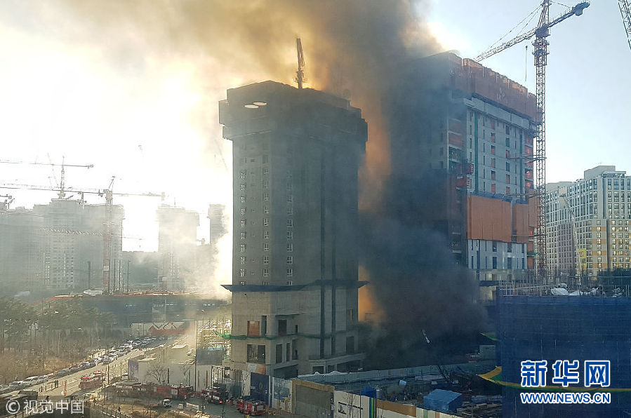 韩国水原市建筑工地发生火灾 现场浓烟滚滚