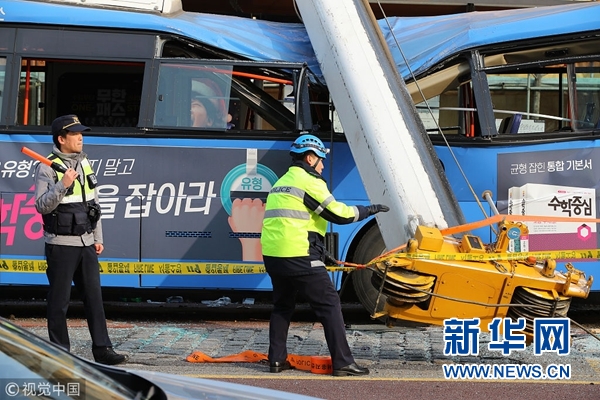 当地时间2017年12月28日,韩国首尔,江西区政府十字路口附近的拆迁工地附近,一辆大型起重机吊臂突然折断,砸中路过的公交车,交通部门立即赶往现场处理。(图片来源:视觉中国)