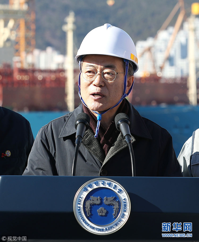当地时间2018年1月3日,韩国巨济岛,韩国总统文在寅造访韩国大宇造船海洋旗下的玉浦造船厂,参观设施,与员工共进午餐,并向员工致以新年问候。(图片来源:视觉中国)