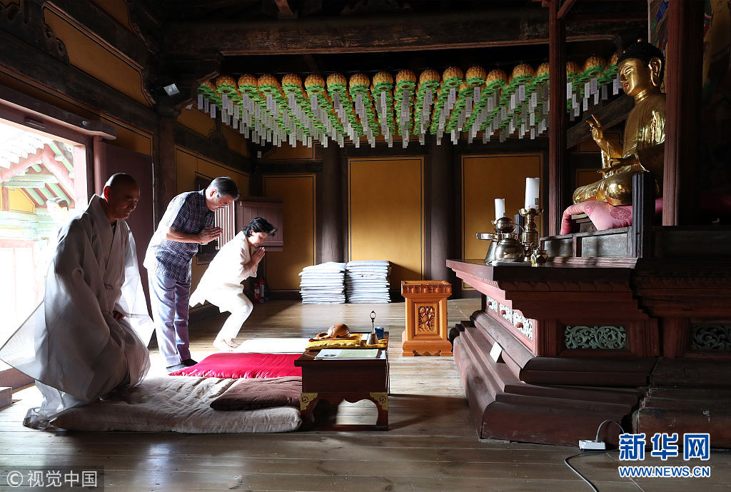当地时间2018年7月28日,韩国庆尚北道,韩国总统文在寅偕夫人金正淑现身当地度周末,造访寺庙,并与寺庙住持喝茶畅谈。(图片来源:视觉中国)