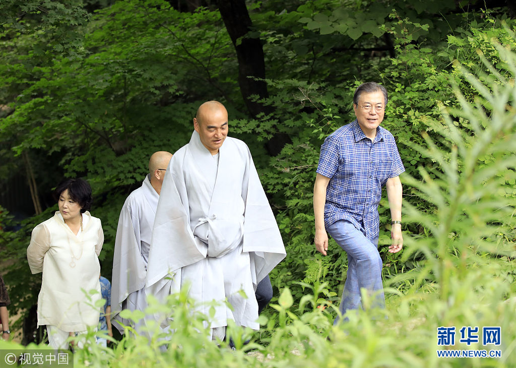 当地时间2018年7月28日,韩国庆尚北道,韩国总统文在寅偕夫人金正淑现身当地度周末,造访寺庙,并与寺庙住持喝茶畅谈。(图片来源:视觉中国)